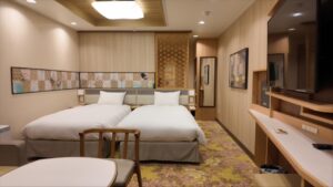 20㎡を超えるツインベッドルームは、バスタブやトイレ、バルコニーまで付いている。展望大浴場が素晴らしいので、バスタブを利用することは無かったが、共同トイレを使用しなくて済むので助かる。