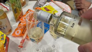 売店で購入したカップ麺と、フリードリンクのホワイトワインで食事を済ませることにした。