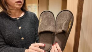 以前、スタンダードに乗船した際は白いスリッパだったが、スイートはふわふわのシックなスリッパだった。