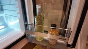 水のベットボトルや、コーヒースティックに加えて、フリードリンクのホワイトワインとオレンジジュースが嬉しい。