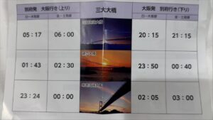 マイカーから降りて乗船すると、すでにレストランには長蛇の列。車輌を利用しない乗客の方が多いため、マイカー利用者は不利だと思われる。勿論ずっと並んでいれば、21:30閉店までに入店できる。しかし、そうすると港から出航のお見送りシーンや、明石海峡大橋のライトアップなどに立ち会えない。